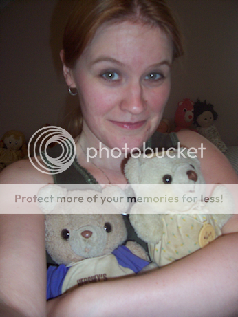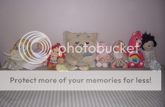 ANYWAY. :D I have something of an old gang who mostly live on the windowseat in my bedroom, except for the few who now room with my daughter. (Some of them are just too fragile anymore.) Terry, the doll who's second from the left, and the Care Bear who's second from the right, were both crocheted by my grandma. Somewhere, I think in my parents' attic, is a four-foot-long Pink Panther she made me c. 1981.